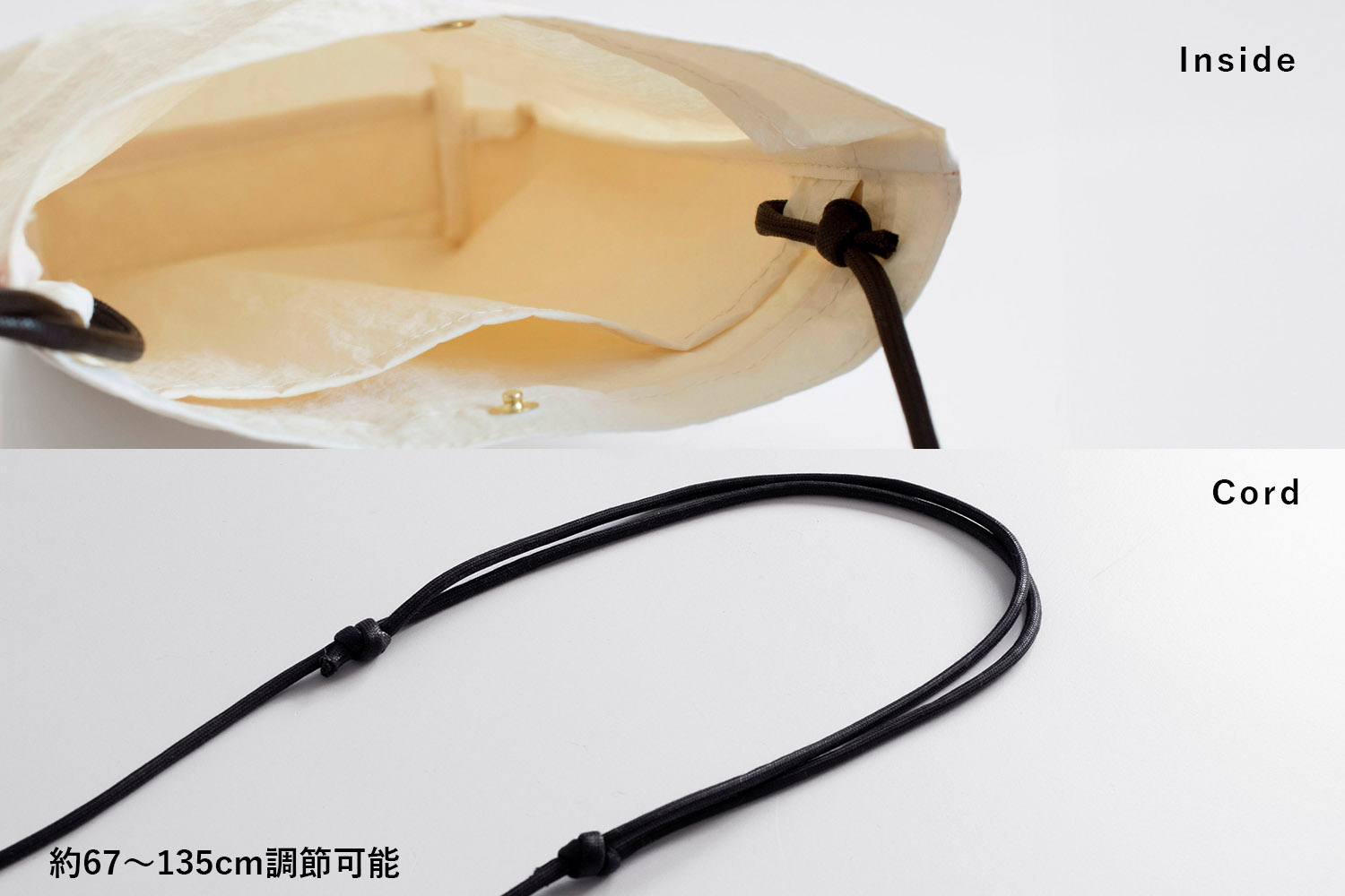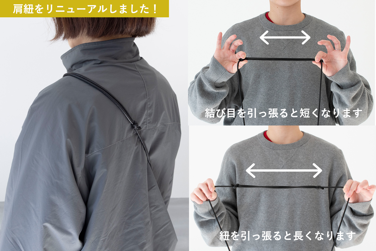 また、2つの結び目をスライドして長さ調節ができ、ずれにくくなりました。