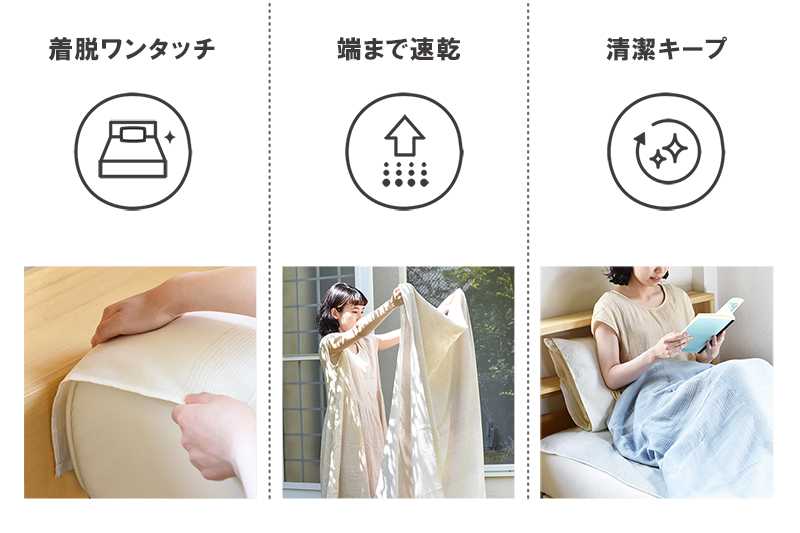 取り換えの億劫さが軽減されるので、洗いたい時にさっと洗えて毎日清潔な環境で快眠できます。