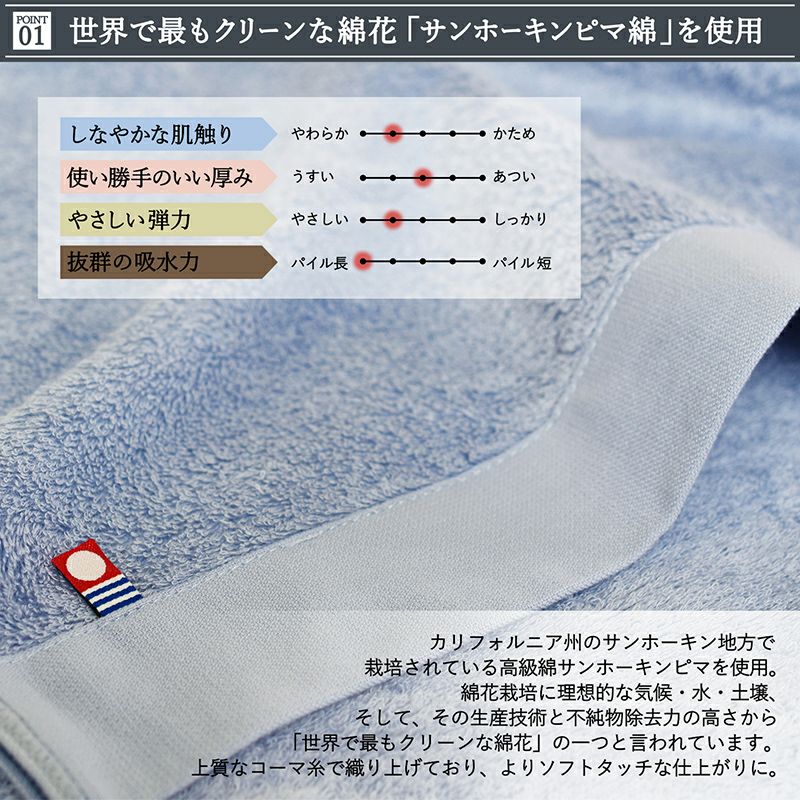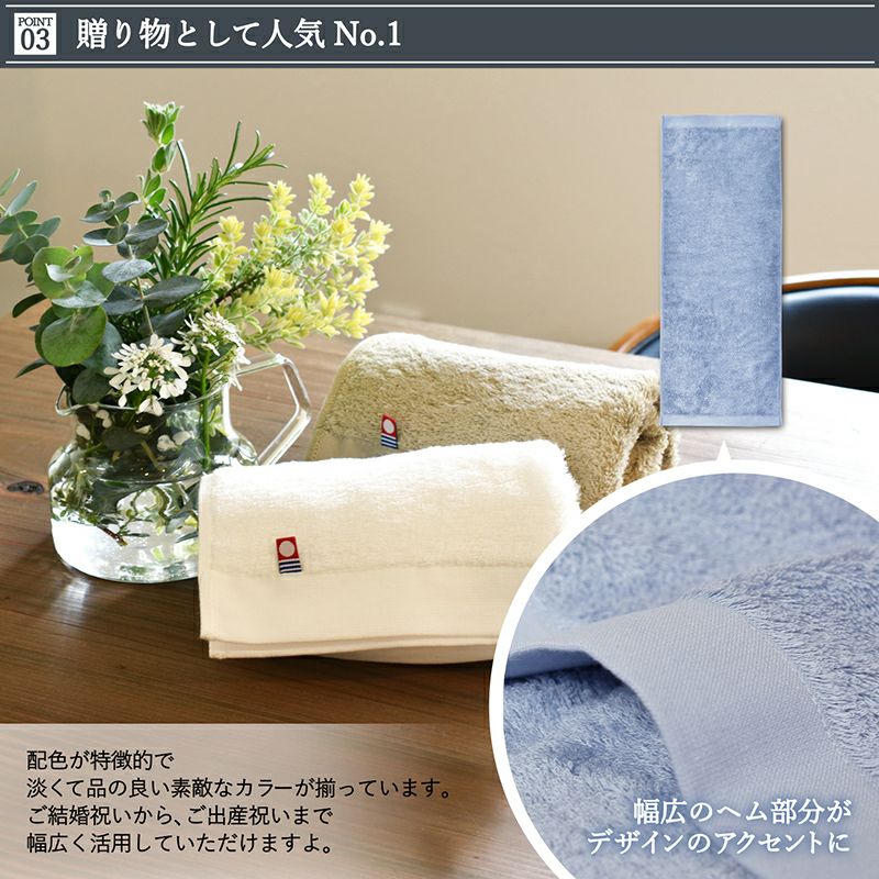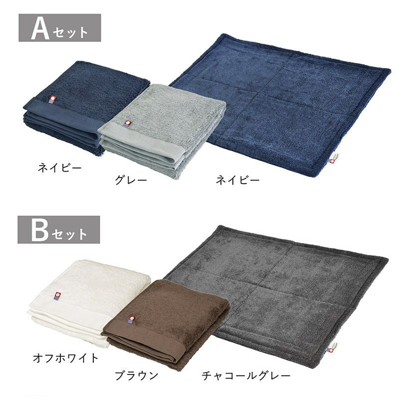 ホテルライクのふかふかとした贅沢な肌触りのバスマット「HOTELALAバスマット」と、 ふんわりボリュームでリゾート気分が味わえるフェイスタオル2枚のギフトセット。 どちらも今治で作られた上質なタオルで、綿素材の特徴である吸水性を最大限に引き出しています。 日常の中でちょっとした贅沢を味わえるギフトセット。 一人暮らしを始められる方など、新生活を始める方への贈り物におすすめです。