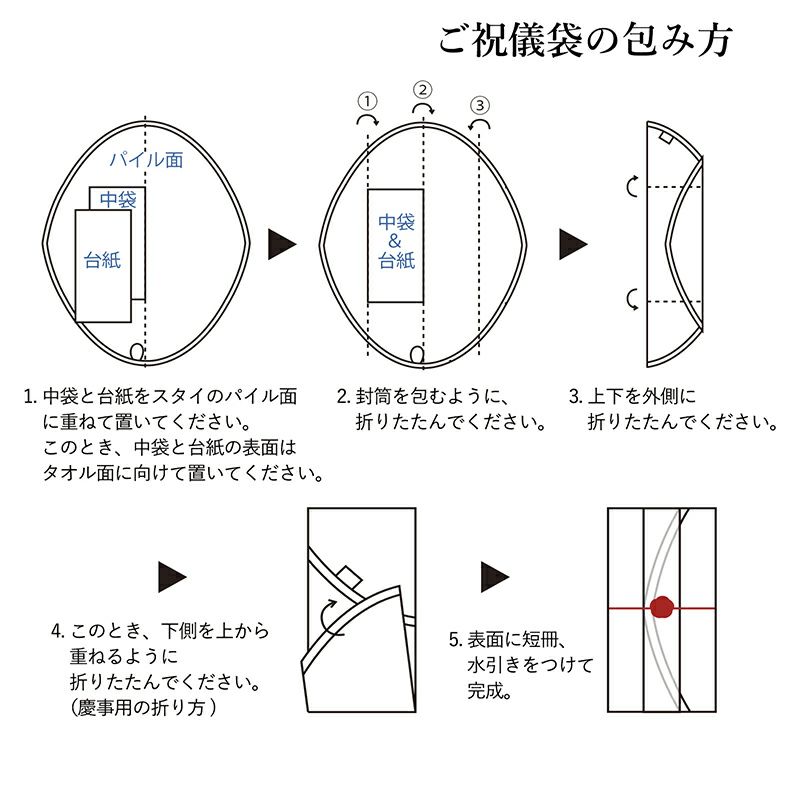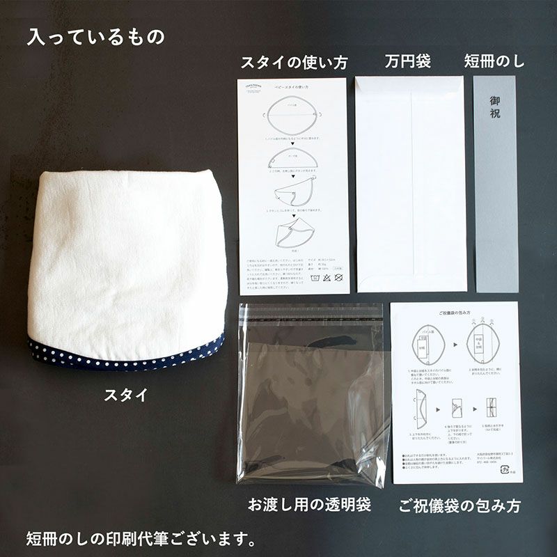 スタイ、スタイの使い方、万円袋、短冊のし、お渡し用の透明袋、ご祝儀袋の包み方が入っています。