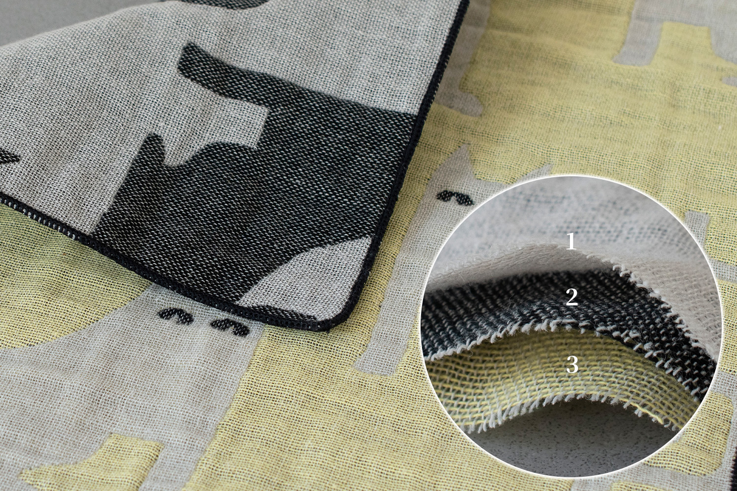 3重ガーゼの優しい風合いと、タテ糸×ヨコ糸で柄を織り出すジャガード織。