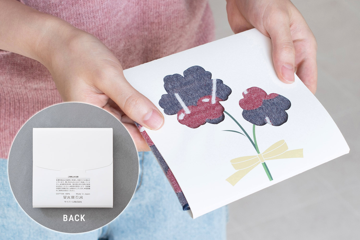 ハンカチをタテ方向にぐるりと包んだ、可愛い花窓のパッケージ入り。