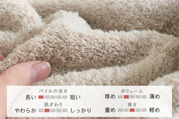 嵩高性と膨らみを持つ原綿を超甘撚りにすることで、繊維間に空気を含み、軽くてやわらかく、ボリューミーで吸水性に優れたタオルに仕上がります。