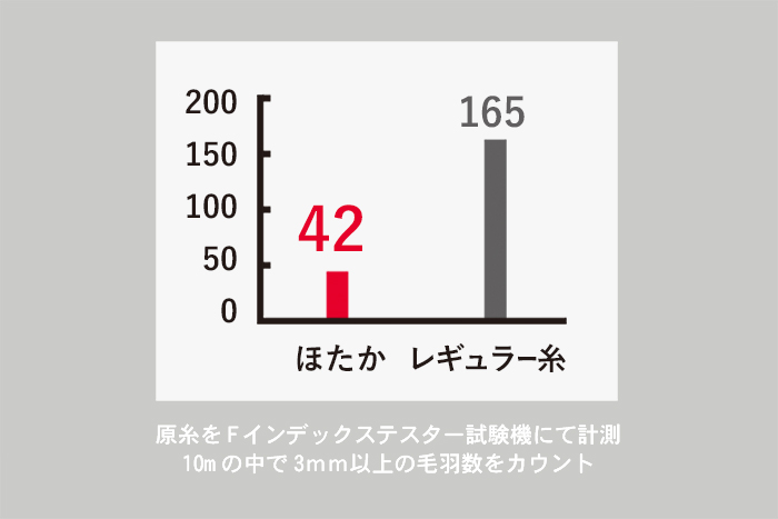 特殊な紡績技術と毛羽を繊維間に収束させる技術、細糸欠点を取り除く工程により毛羽落ち軽減を実現しました。