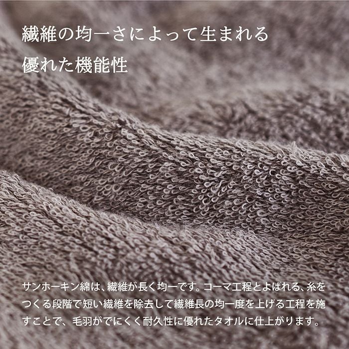 コーマ工程とよばれる、糸をつくる段階で短い繊維を除去して繊維長の均一度を上げる工程を施すことで、毛羽がでにくく耐久性に優れたタオルに仕上がります。