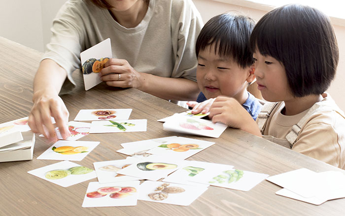 食べたことのあるものを見て味を思い出し、言葉にする発想力を育てます。