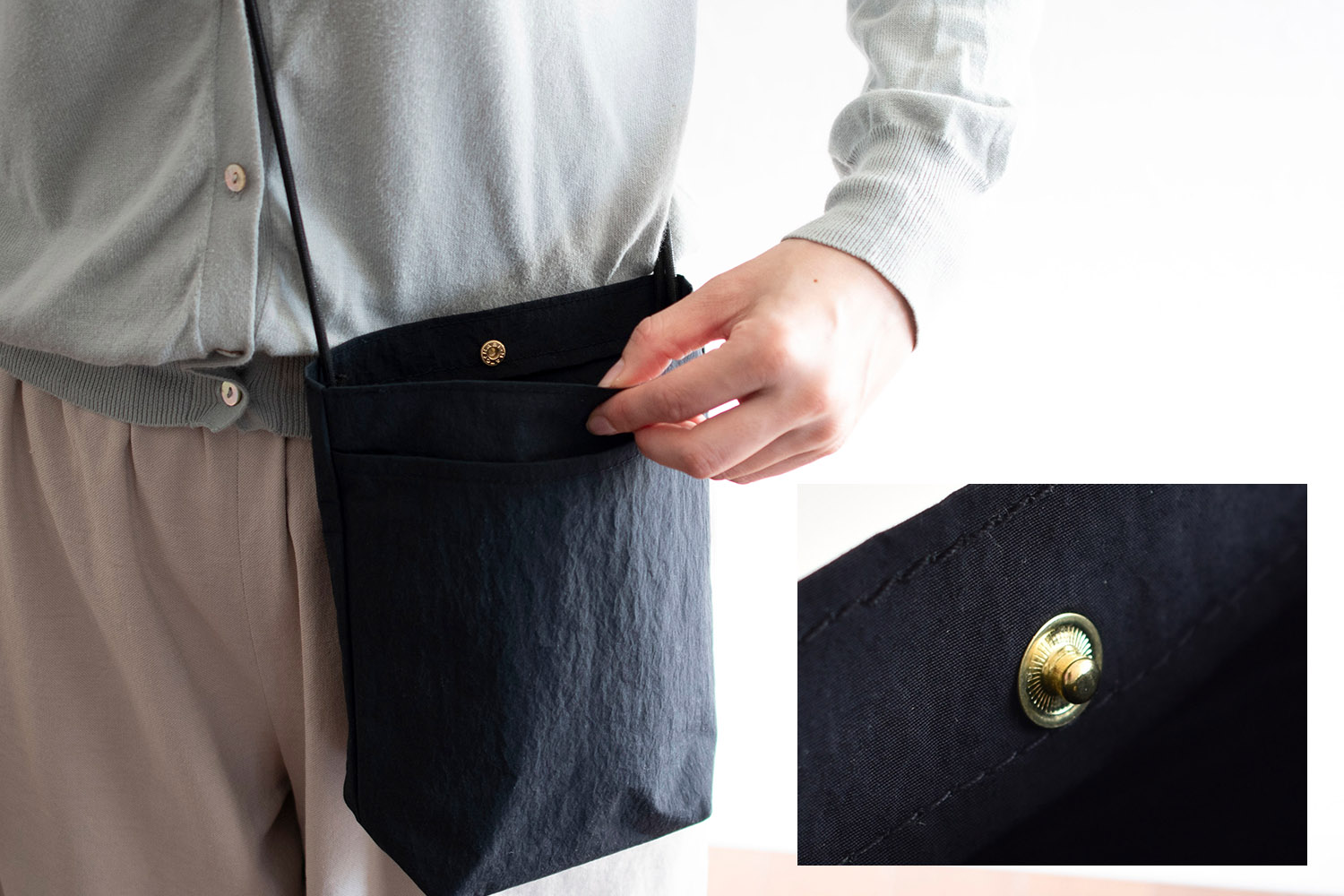 飛び出し防止のためにスナップボタンが付いています。