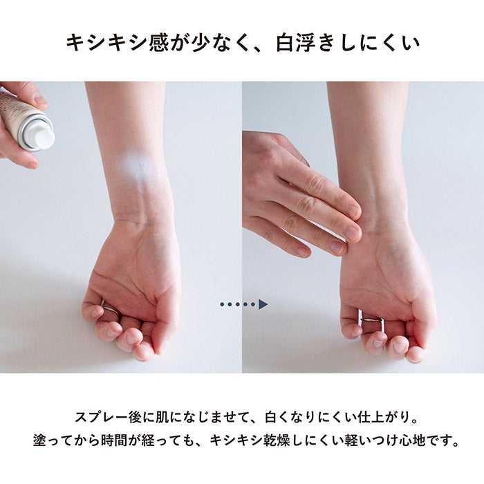 スプレー後に肌になじませて、白くなりにくい仕上がりです。