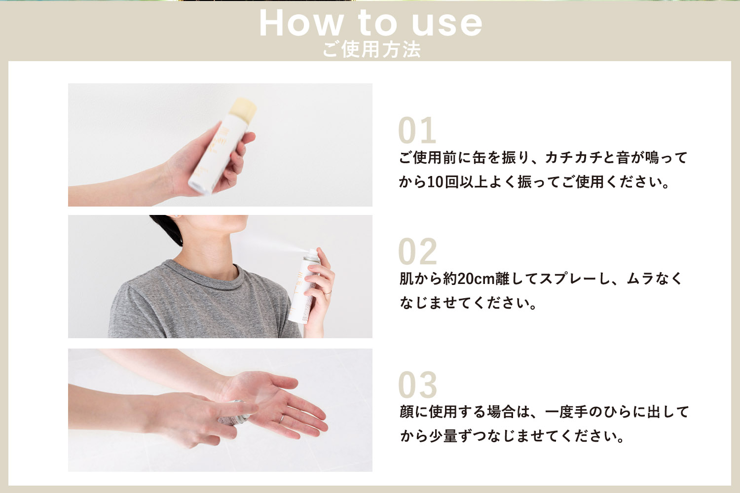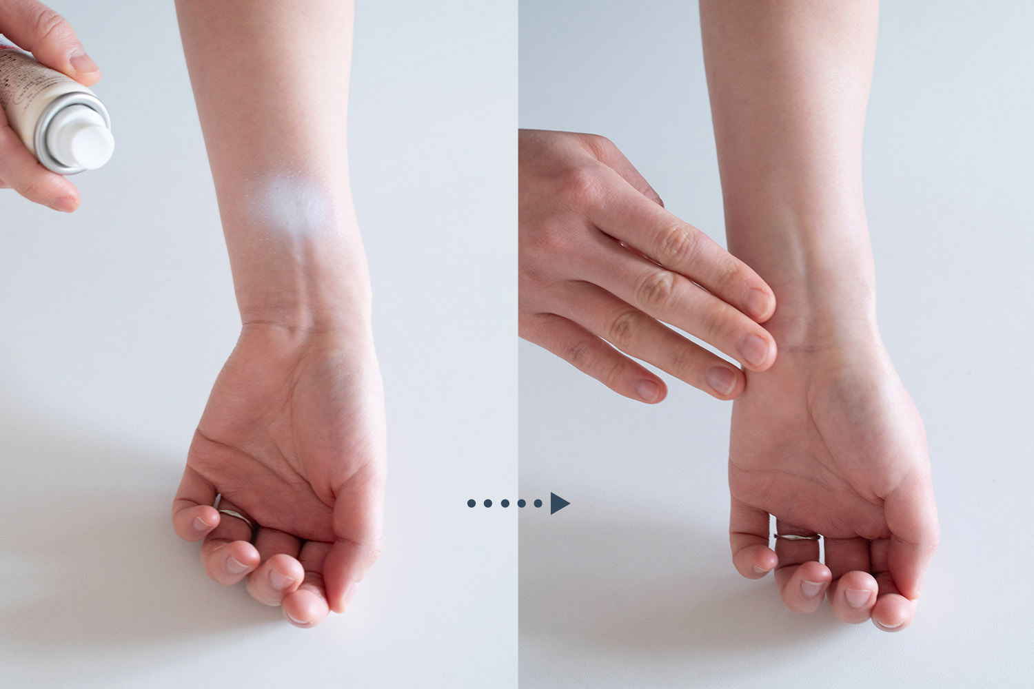 スプレー後に肌になじませて、白くなりにくい仕上がりです。