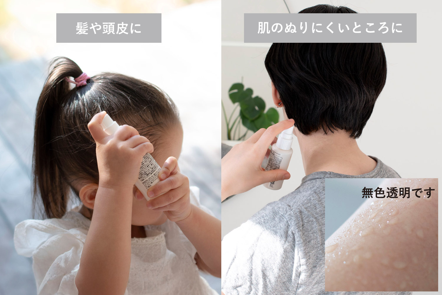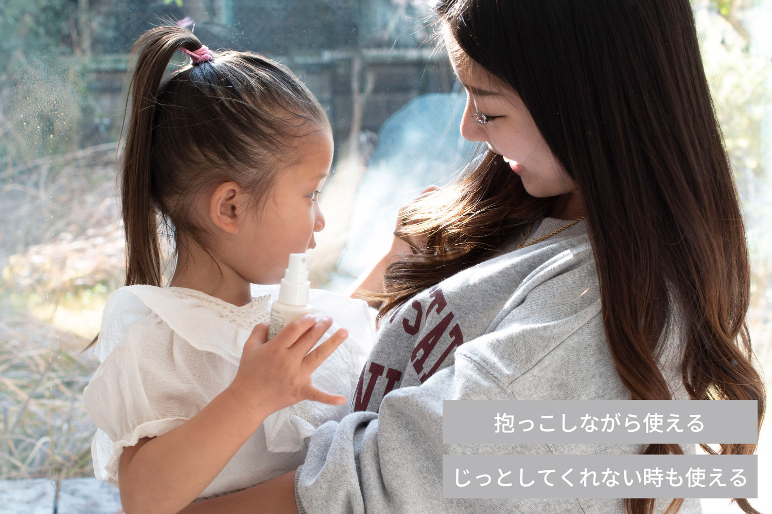 抱っこしながらでも、元気に動き回っていても塗りやすいのがスプレータイプの良いところ。