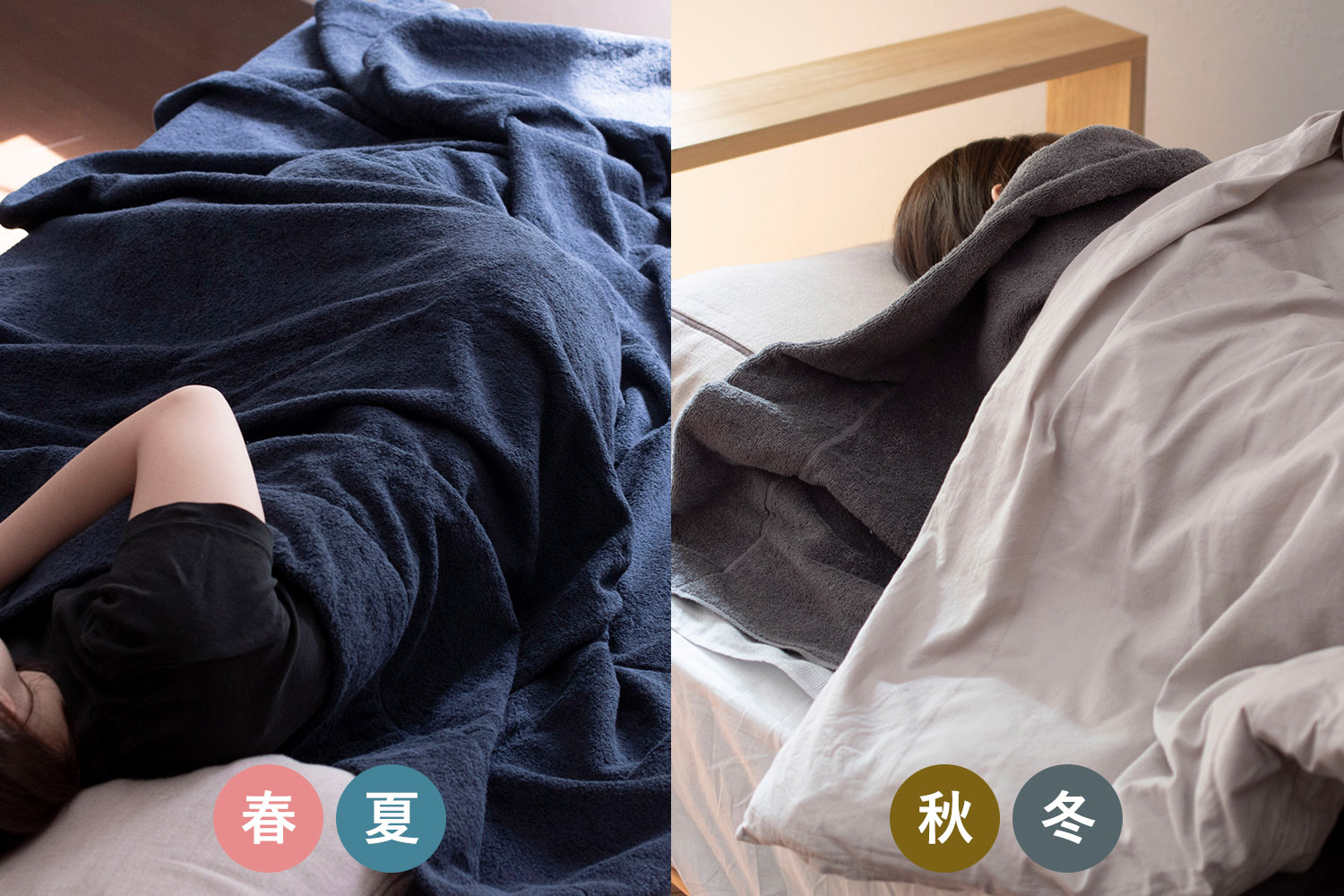 夏はもちろん、冬は羽毛布団の中に仕込むと、こもった汗を吸水しサラサラ肌で身体を温めます。
