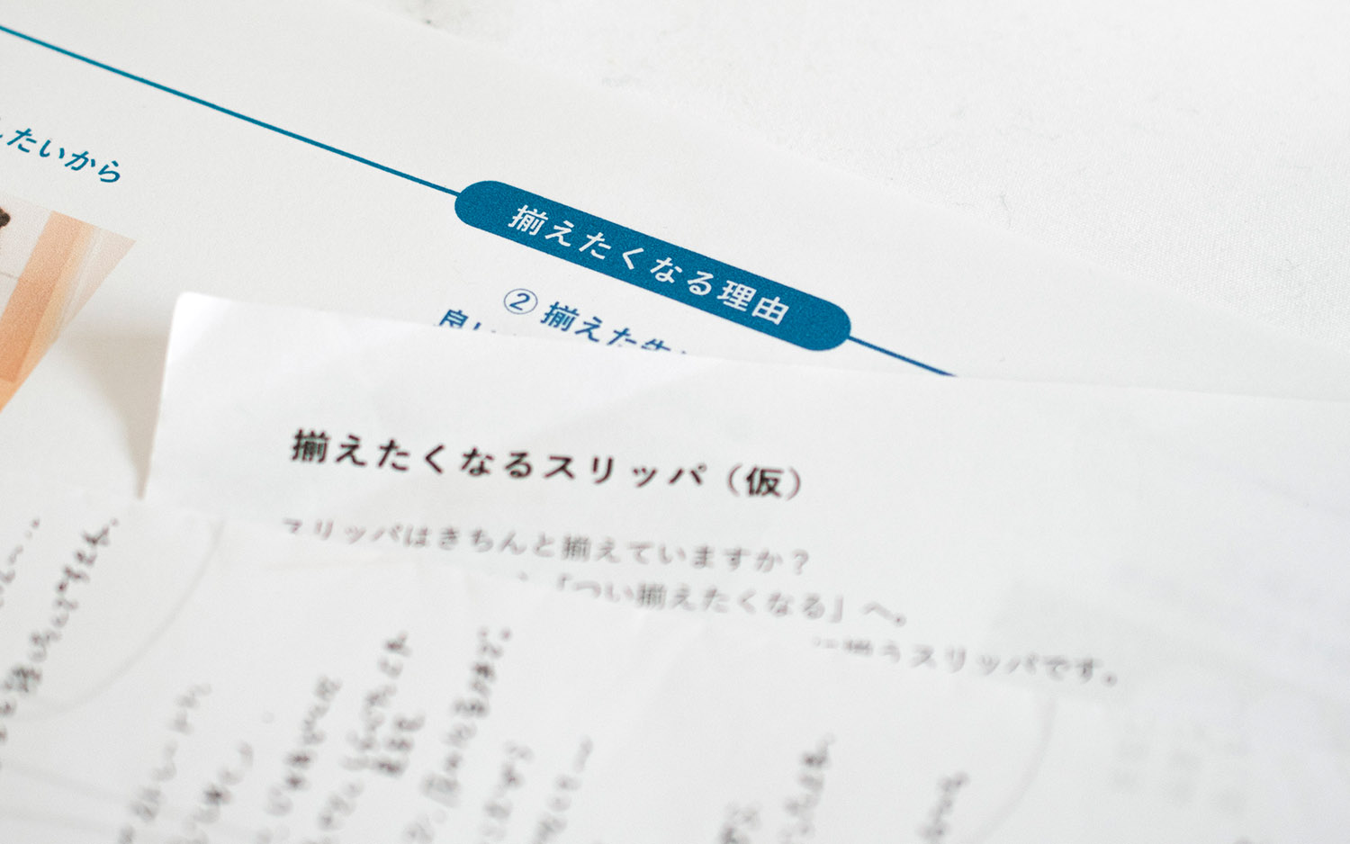 確かに…、履きやすさは大事ですよね。…じゃあ、履き心地は基本を忠実に、パズルのアイデアに代わる「揃えたくなる何か」をプラスαしてあげれば、きっと履きたくなるスリッパになるはずですよね?もう少し案を練ってみようと思います! |